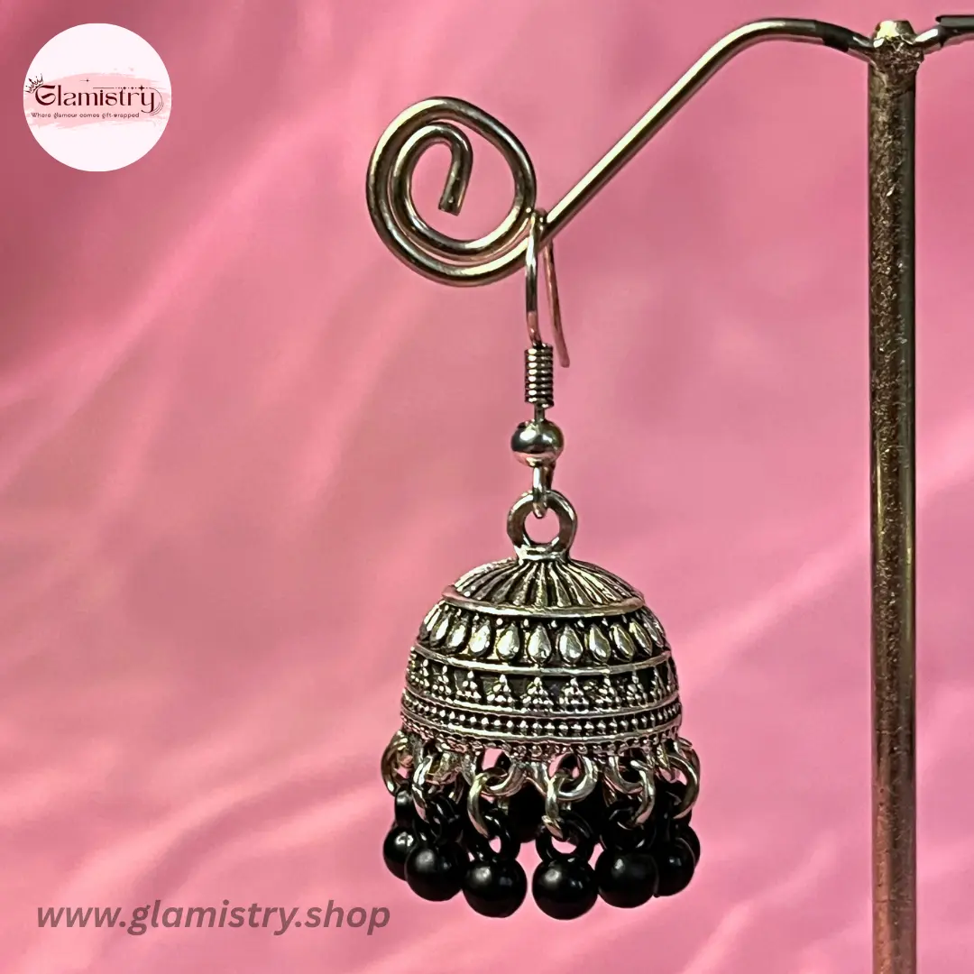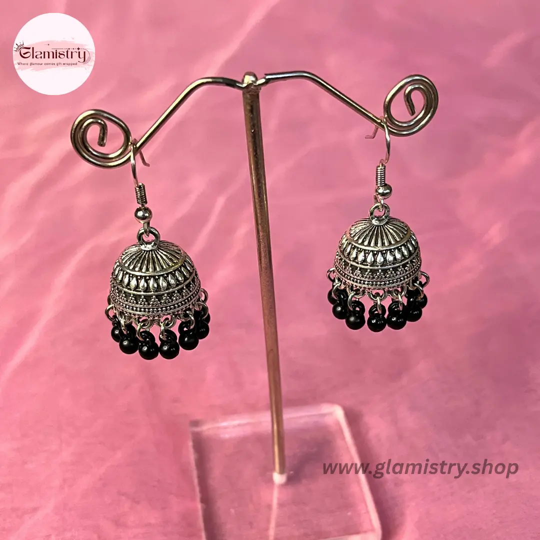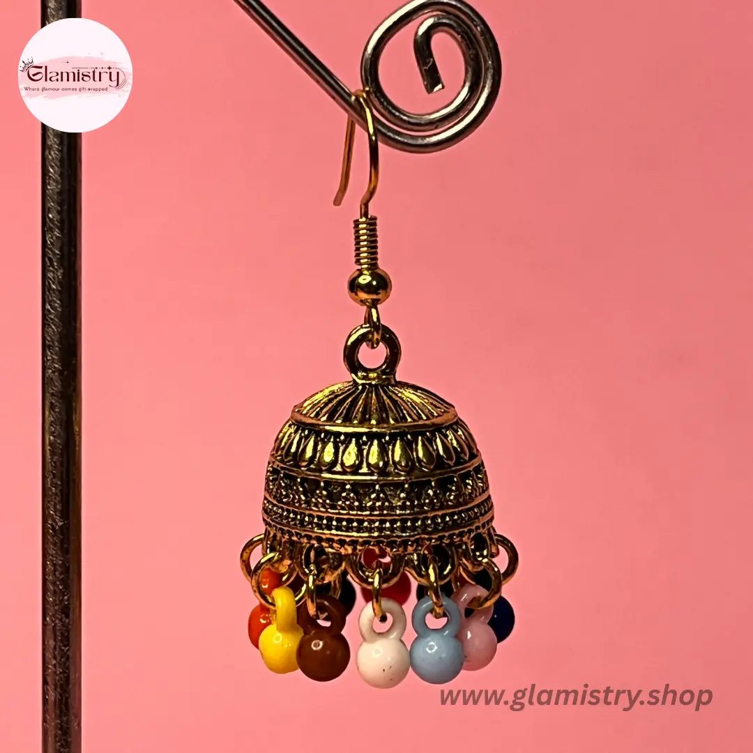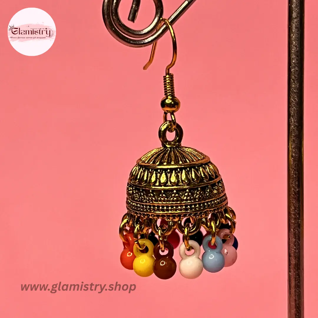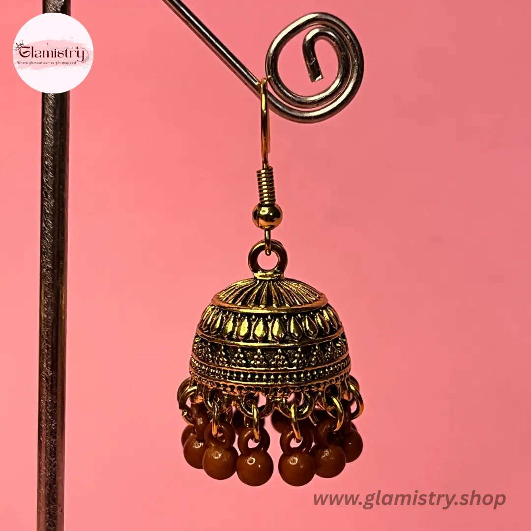 Elegant dome-shaped jhumka earrings with intricate metal detailing and brown bead drops, perfect for adding a traditional yet stylish touch to any outfit.
